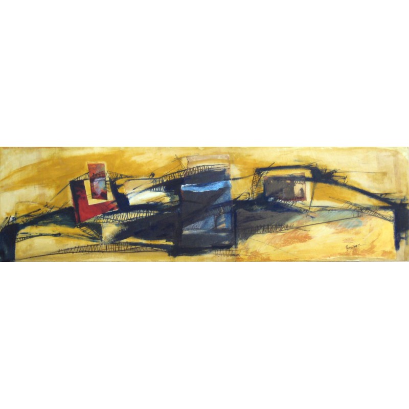 L'opera di Massimo Faraci è un esempio della sua pittura astratta gestuale, caratterizzata da un intenso dialogo tra superficie materica e segno cromatico. La tela è dominata da un profondo blu scuro/notturno e dal bianco e grigio, evocando un paesaggio marino o uno spazio cosmico in tempesta. L'artista utilizza una tecnica di stratificazione, in cui il colore viene steso con vigorose pennellate orizzontali e verticali che creano un senso di movimento e inquietudine.