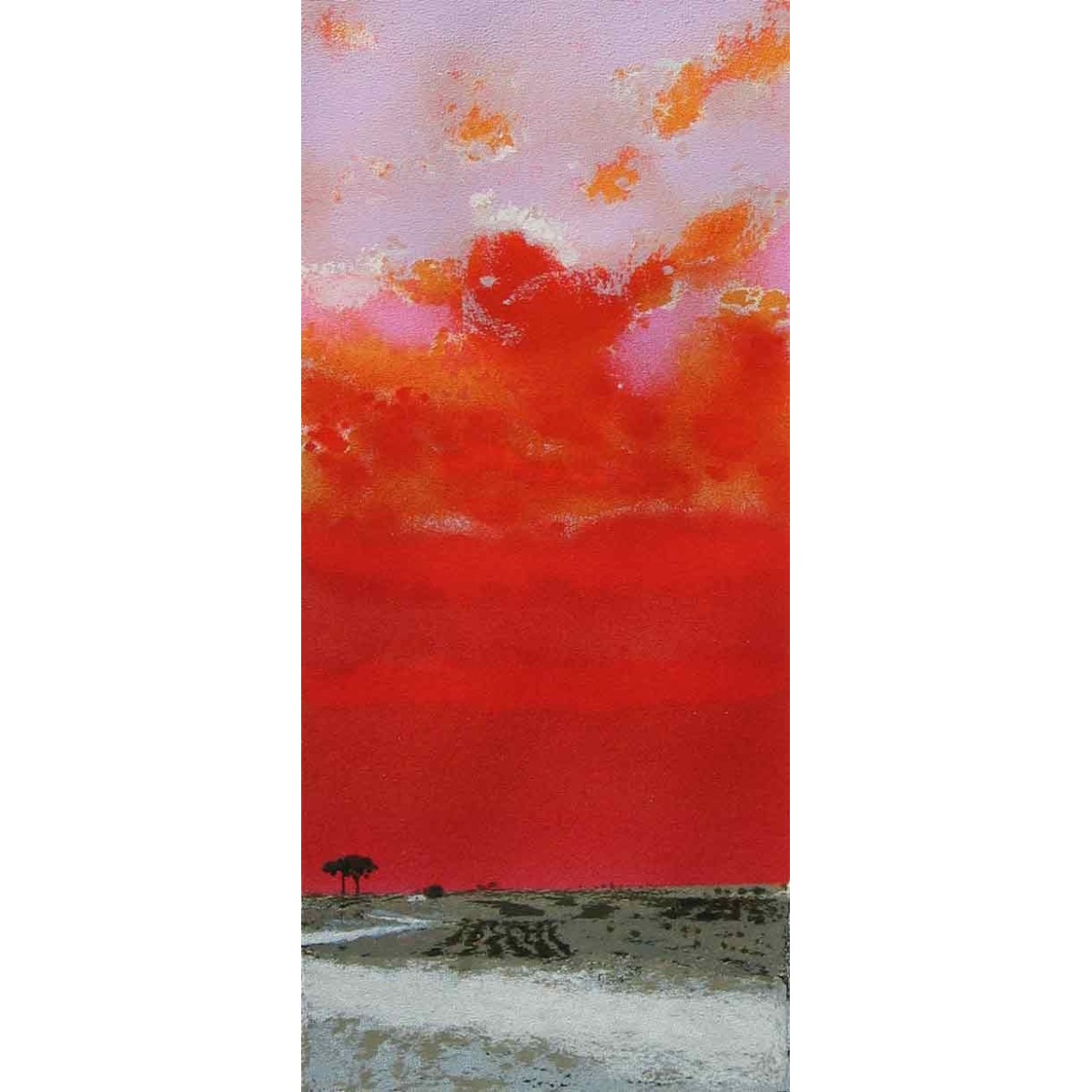 Questa vibrante serigrafia di Natale Addamiano trasporta l'osservatore in un paesaggio infuocato, dominato da un cielo rosso intenso che suggerisce un tramonto o un'alba drammatica. La palette audace, con sfumature di rosa e arancio che si fondono nel profondo scarlatto, crea un senso di calore avvolgente e mistero. In contrasto, la sottile silhouette di alberi e la linea dell'orizzonte terrestre, con accenti di grigio e verde, ancorano la composizione, offrendo un momento di quiete in mezzo alla potente esplosione cromatica.