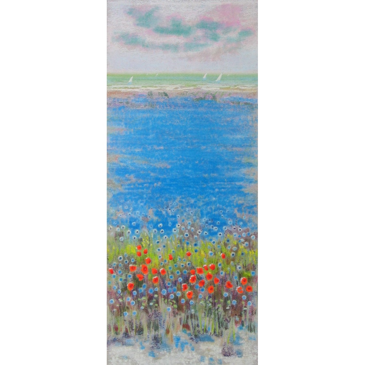 Questa serigrafia verticale di Addamiano unisce il mare azzurro in primo piano con un tappeto di fiori selvatici e papaveri rossi. La composizione sfrutta il contrasto tra il vibrante blu marino e le fioriture colorate, creando una scena di quiete estiva dove la terra fiorita incontra l'orizzonte.