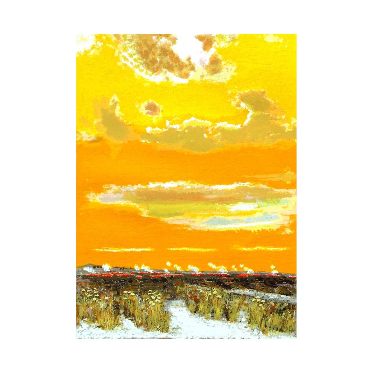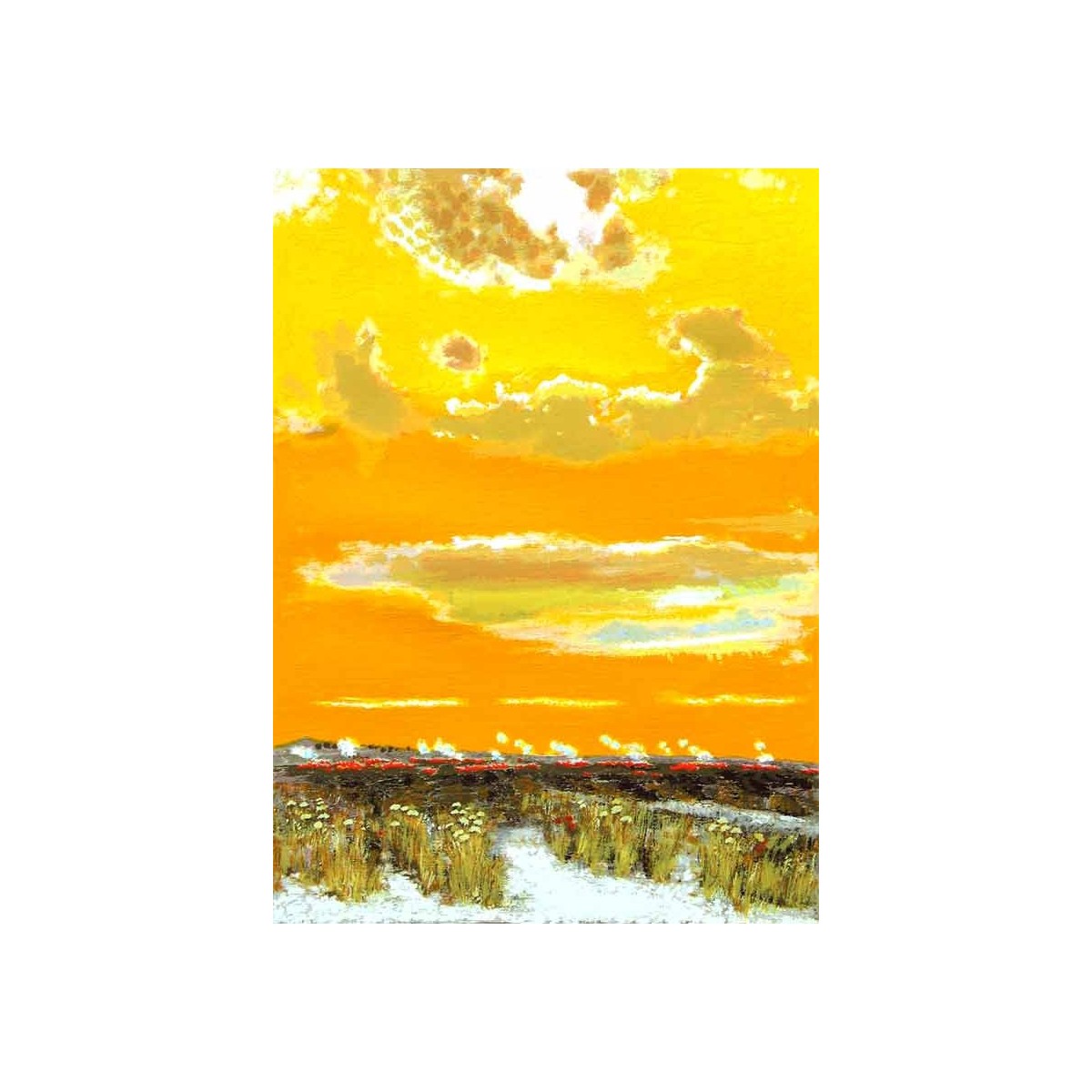 Questa serigrafia è un'opera di grande impatto visivo dominata dal giallo e arancio intenso del cielo e dell'atmosfera. La composizione è pervasa da una luce drammatica che suggerisce fuoco o un tramonto estremo. In basso, la terra scura e la vegetazione creano un netto contrasto, con piccoli punti luminosi che evocano le fiamme o i riflessi, enfatizzando il tema della natura infuocata e della potenza della luce.
