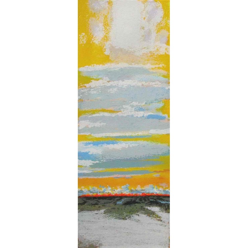 Questa serigrafia verticale è dominata da un cielo drammatico in giallo e bianco, con bande orizzontali di nuvole che creano un senso di profondità. L'orizzonte è una linea scura e netta punteggiata di rosso, che allude al tema dei campi che bruciano o al riverbero di un tramonto intenso. La terra in primo piano è risolta con ampie stesure di grigio e verde scuro, contrastando nettamente con la potente luminosità del cielo.