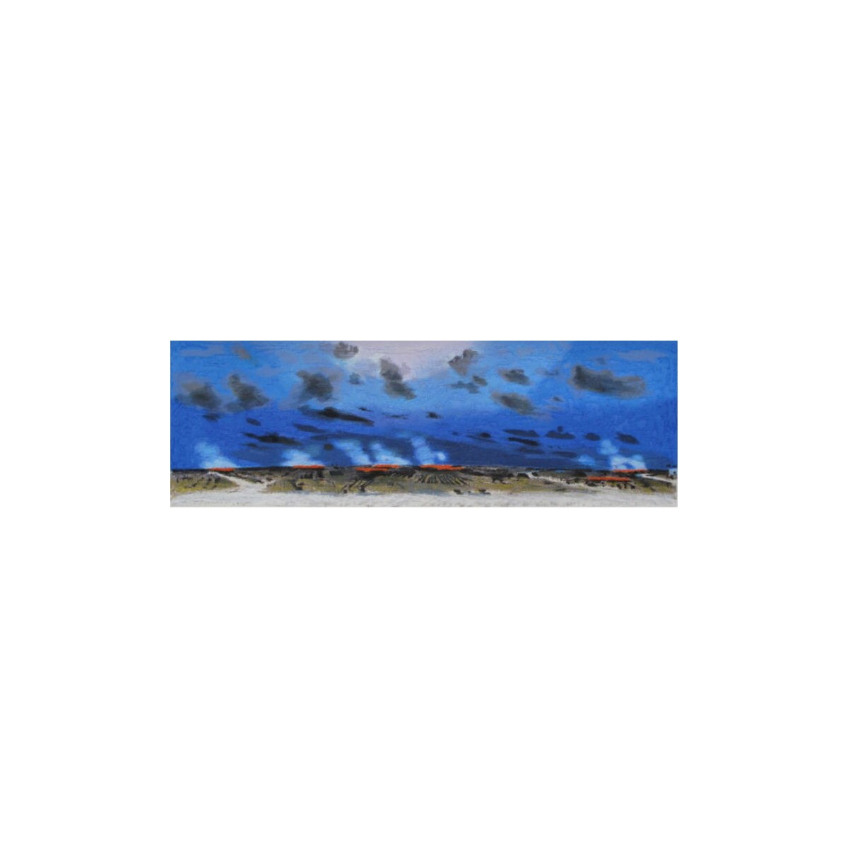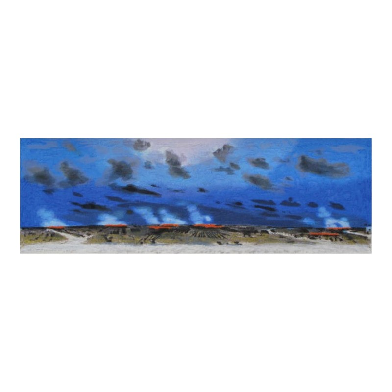 Questa serigrafia orizzontale, una variante del tema "Campi che bruciano", presenta un contrasto cromatico notevole: il blu profondo e vibrante del cielo è drammatizzato da nuvole scure e mosse. L'orizzonte terrestre, quasi monocromo, è punteggiato da strisce orizzontali di rosso fuoco, che indicano le fiamme dei campi, creando un'atmosfera tesa tra la fredda vastità del cielo e il calore terrestre del fuoco.