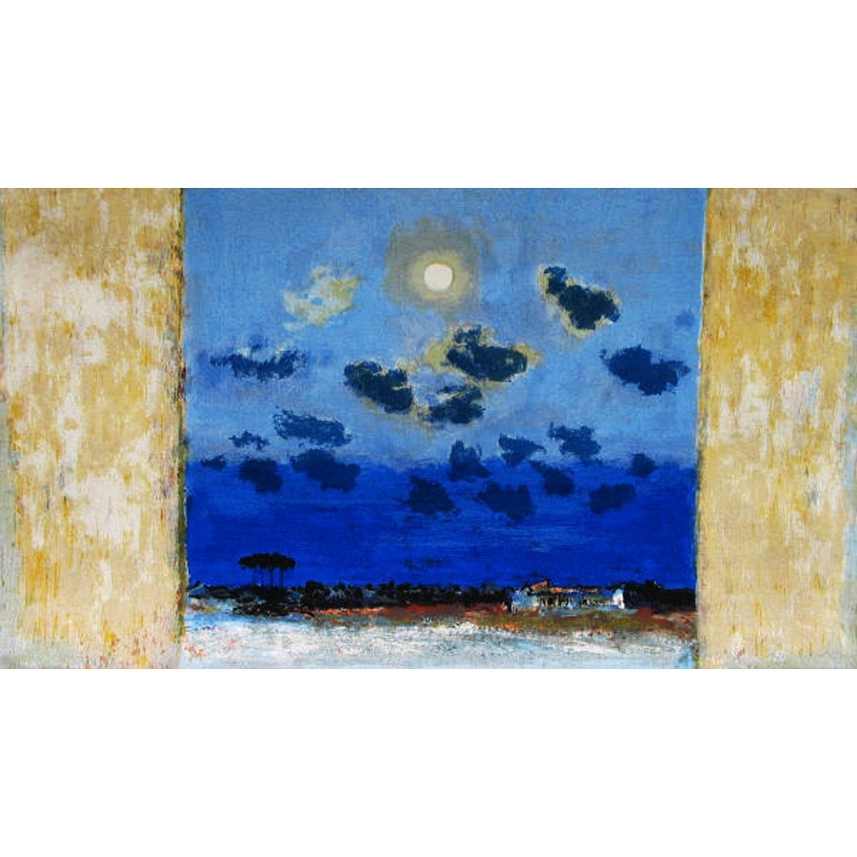 Una veduta notturna incorniciata da due quinte laterali ocra, che focalizzano lo sguardo su una luna luminosa sospesa in un cielo ceruleo punteggiato da nubi scure. All'orizzonte, il profilo della terra e di una casa bianca si stagliano contro un blu profondo, sopra un primo piano candido e vibrante.