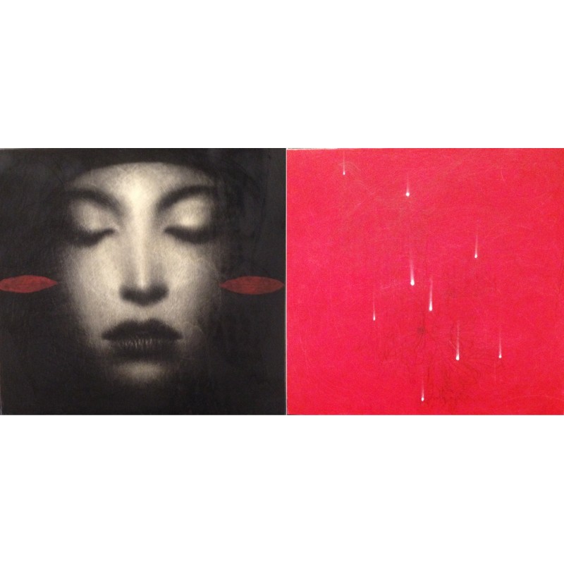 L'opera di Omar Galliani, intitolata In porpora, è un dittico che rappresenta l'essenza della sua ricerca artistica sulla bellezza femminile e la dualità. L'installazione è realizzata con tecnica mista (spesso matita, pastello rosso e grafite) su tavola. Il pannello di sinistra presenta un volto femminile, dai tratti intensi e classici, realizzato con la caratteristica tecnica dello sfumato che emerge da un fondo scuro e misterioso. Ai lati del volto, due segni rossi che ricordano delle foglie o delle labbra enfatizzano il tema della passione e del sacro, tipico della sua produzione.