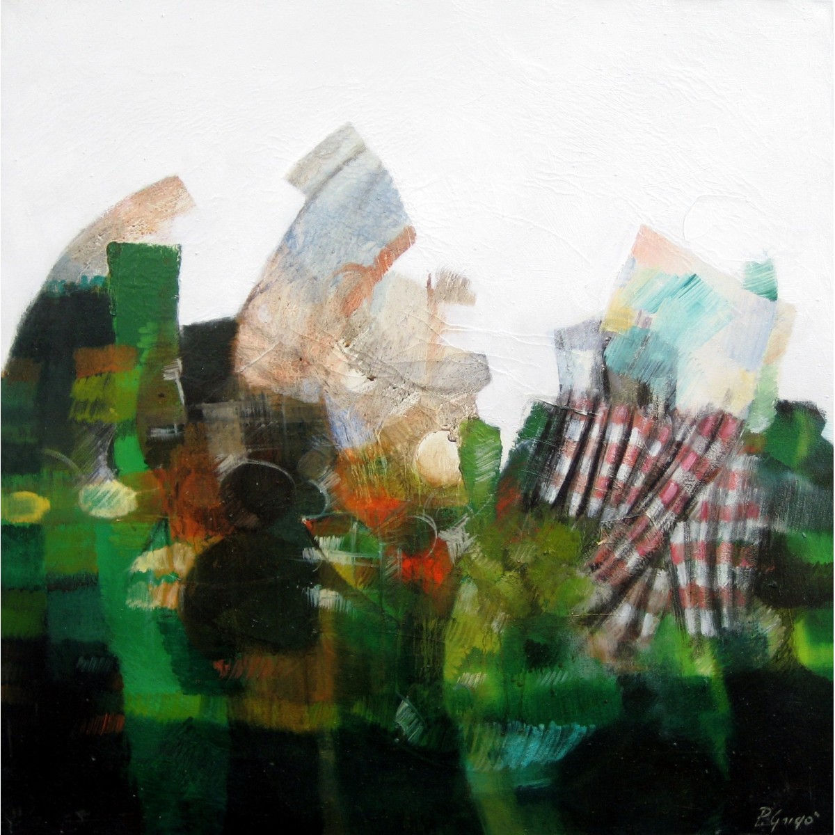 “Paesaggio marino" è un dipinto figurativo-astratto dominato da tonalità di verde e marrone su un vasto sfondo bianco luminoso. La composizione utilizza forme frammentate e blocchi di colore, riconducibili a strutture edilizie o naturali in uno stile cubista-espressionista. Una sagoma scura in primo piano e le pennellate dinamiche infondono un senso di mistero e movimento alla scena costiera. L'opera si distingue per l'uso di forti contrasti cromatici e una composizione apertamente frammentata.