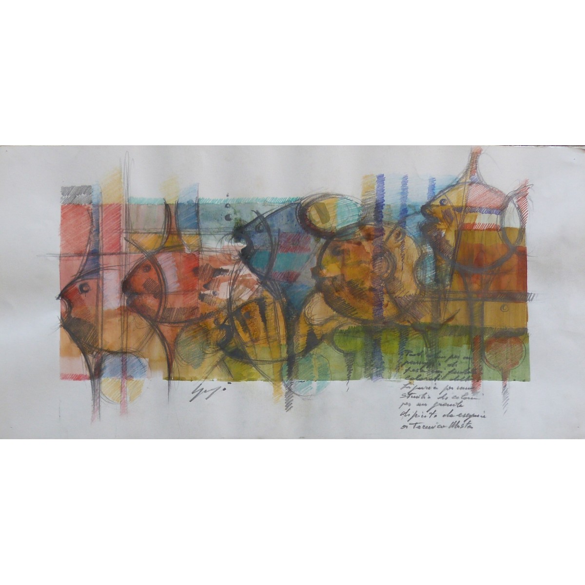 "Particolare per un paesaggio" è una vivace opera a tecnica mista che cattura un gruppo di pesci stilizzati in una composizione orizzontale. L'artista fonde il disegno a matita energico e curvilineo, che delinea le figure, con blocchi di colore ad acquarello trasparente e sovrapposto, evocando l'ambiente marino.