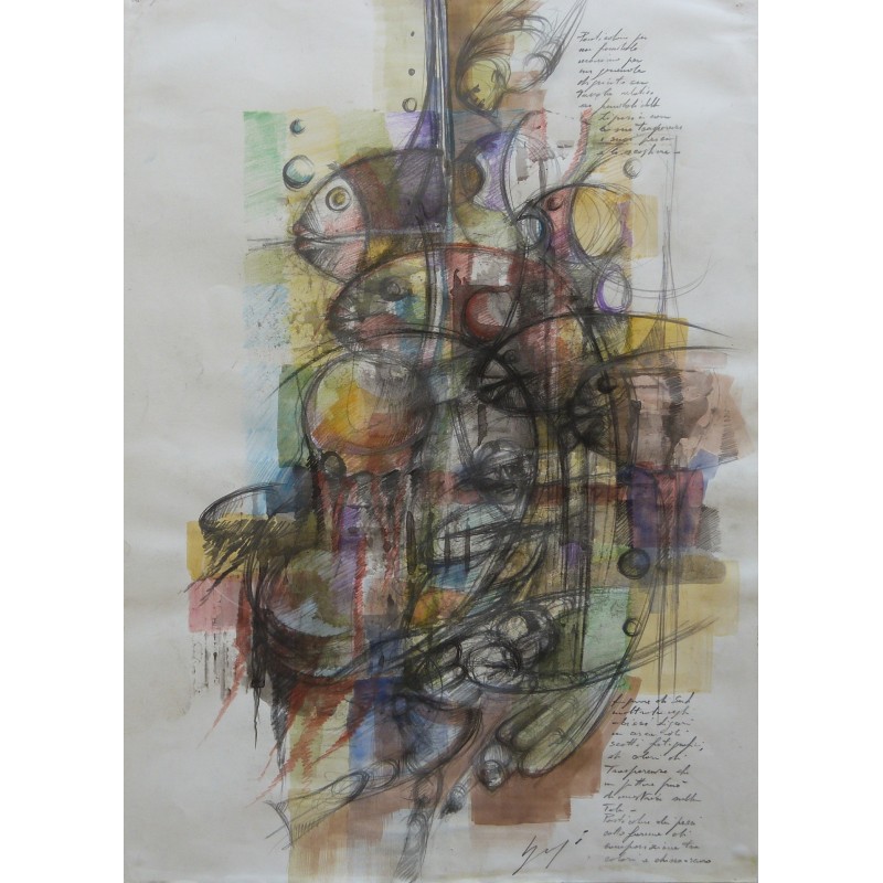"Particolare per un fondale marino" è un'intensa opera verticale a tecnica mista che esplora il tema della vita sottomarina con una composizione dinamica e complessa. L'artista utilizza un reticolo di segni a matita scuri e vorticosi per delineare figure astratte e elementi marini come pesci e bolle, che si fondono con blocchi di colore a macchia e tonalità acquerellate.