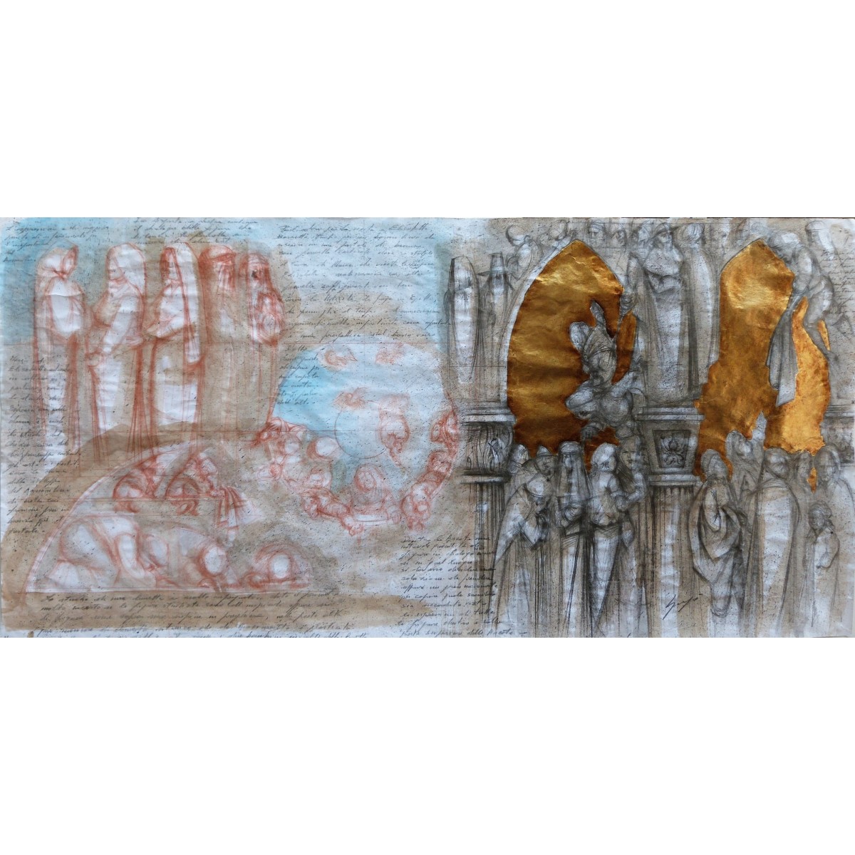 Questo grande bozzetto panoramico a tecnica mista è caratterizzato da una forte divisione compositiva tra la sinistra, dominata da file di figure in veste delineate in sanguigna e una fitta scrittura autografa, e la destra, monumentale. Quest'ultima presenta due grandi nicchie architettoniche rivestite in foglia d'oro lucente, le quali incorniciano e proteggono figure scultoree in grafite.