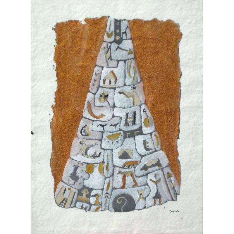 Quest’opera di Roberto Cosimi raffigura una forma piramidale composta da blocchi di pietra che racchiudono segni, figure e piccole abitazioni. Le tonalità calde dell’ocra e del grigio si fondono in una struttura che evoca un antico villaggio o una montagna simbolica, popolata da tracce umane e animali.