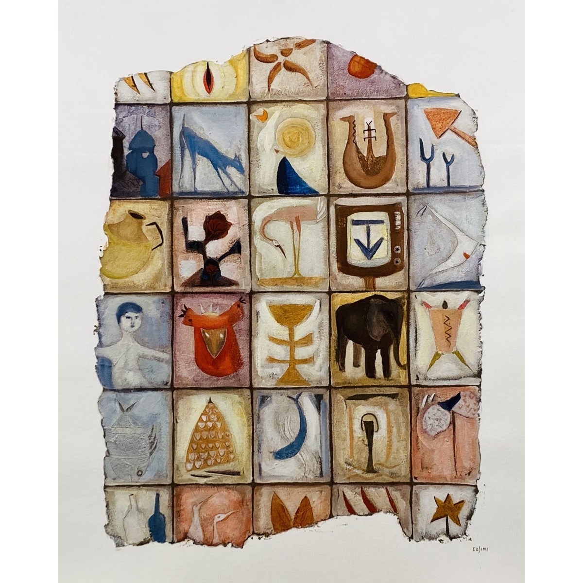 Un mosaico onirico di simboli arcaici e figure stilizzate che evocano un linguaggio visivo ancestrale e poetico.