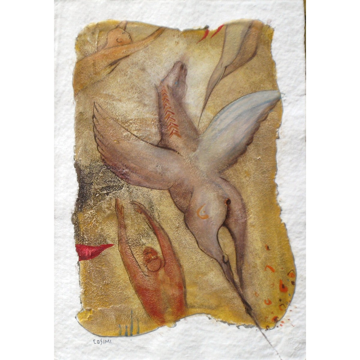 Quest’opera di Roberto Cosimi mostra una figura alata che domina la scena, accompagnata da corpi umani sospesi in un’atmosfera dorata e luminosa. Le tonalità calde e terrose si fondono con i segni leggeri e le velature, evocando un sogno di elevazione e libertà.
