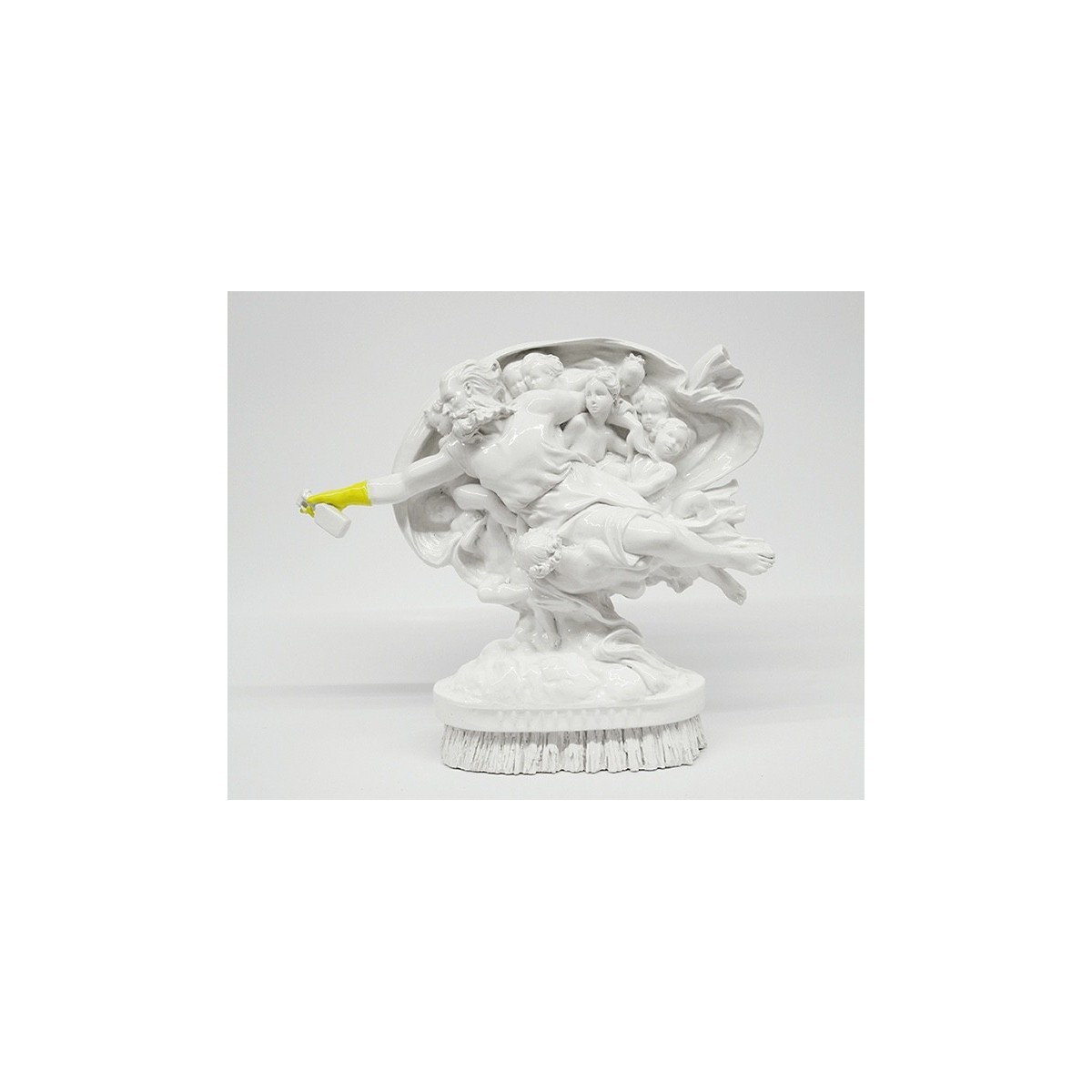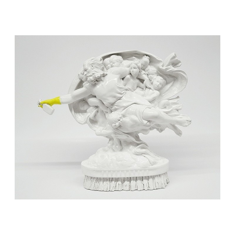 La scultura si presenta come un ready-made classico, con figure angeliche e divine in stile neoclassico, monocromatiche e bianche, che richiamano l'iconografia sacra e la purezza del gesso. L'intervento dissacrante del collettivo, che costituisce il marchio di fabbrica della loro pratica, è duplice. L’espressione “Celito lindo” unita a questi elementi sovversivi crea un dialogo ironico tra l'elevato e il banale, commentando la mercificazione della cultura e la costante necessità di "pulire" o riordinare l'eredità storica.